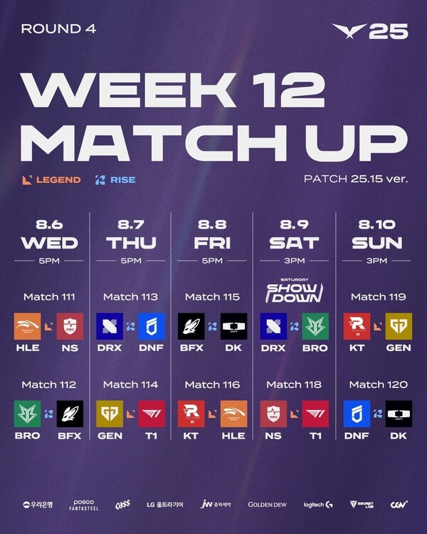 라이엇 게임즈가 개발 및 서비스하는 '리그 오브 레전드(LoL)'의 이스포츠 한국 프로 리그인 LCK를 주최하는 리그 오브 레전드 챔피언스 코리아(대표 오상헌)는 8월 6일(수)부터 8월 10일(일)까지 서울 종로구 그랑서울 롤파크에 위치한 LCK 아레나에서 2025 LCK 4라운드 1주 차 일정이 진행된다고 밝혔다.