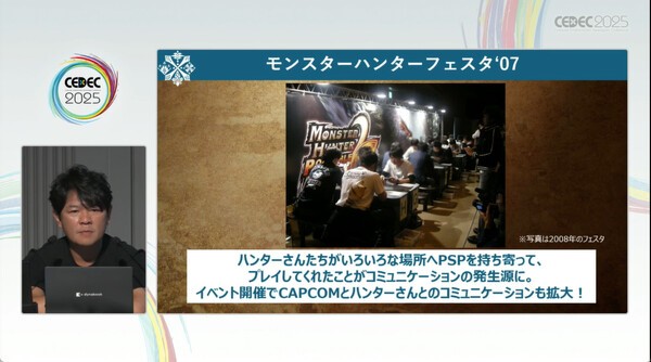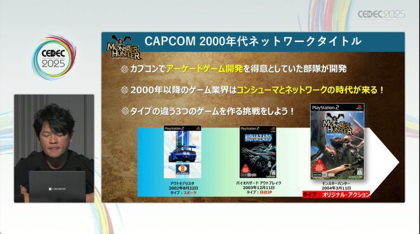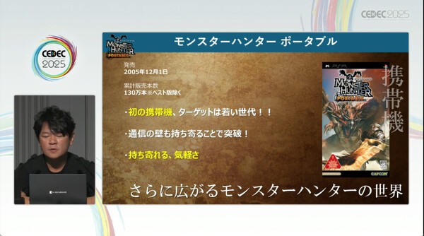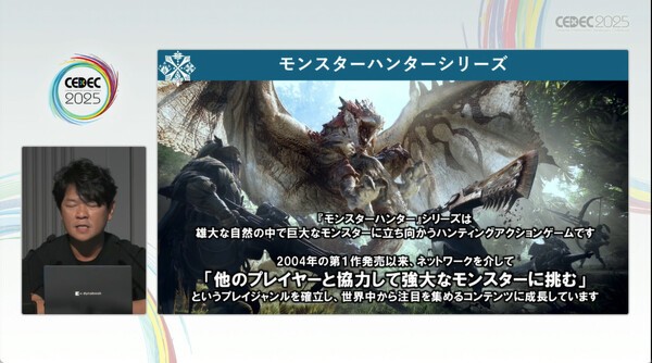 이 발표는 캡콤 이사 겸 전무 집행임원이자 CS 제2 개발 총괄 ‘몬스터헌터’ 시리즈 프로듀서인 츠지모토 료조 씨가 진행했다. 그리고 이 강연은 츠지모토 씨가 참여한 콘솔판 시리즈를 중심으로 진행됐으며, 그는 스태프 대표로 무대에 올랐다고 밝혔다.