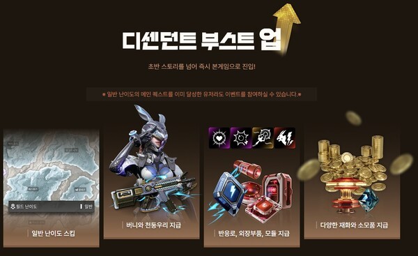 빠르게 성장하고 게임에 녹아들 수 있는 시스템을 도입하여 신규, 복귀 이용자들의 진입장벽을 대폭 낮춘 것도 한몫했다. 먼저, 일반 난도 퀘스트를 일괄 완료하고 어려움 난도가 개방되는 ‘디센던트 부스트 업’을 통해 빠르게 신규 콘텐츠를 경험할 수 있다. 이와 함께, 인기 ‘계승자’ ‘버니’를 비롯해 궁극 무기, ‘반응로’, ‘외장 부품’, ‘에너지 활성체’, 각종 재화 등을 지급해 신규 이용자의 수월한 플레이를 돕는다.