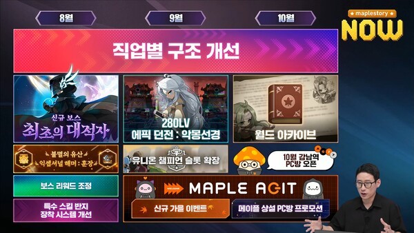 넥슨에서 ‘메이플스토리’를 총괄하는 김창섭 디렉터는 지난 14일 진행된 공식 방송 ‘메이플 NOW’를 통해 8월 업데이트 내용과 9~10월 하반기 로드맵을 공개했다.