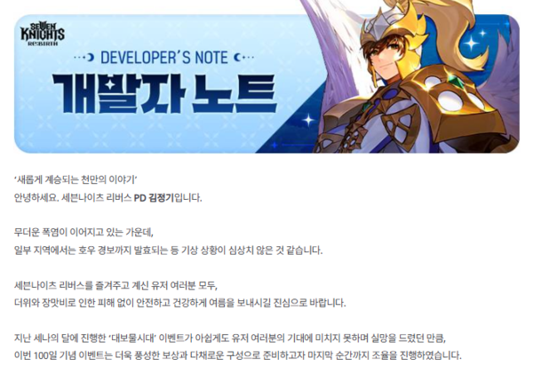김정기 '세븐나이츠 리버스' PD는 새로운 개발자 노트를 통해 신규 업데이트 내용과 다가올 변경점, 서비스 100일 맞이한 게임의 유저 이벤트를 미리 전했다. 또한 차차주 업데이트 예고까지 더하면서 게임의 콘텐츠 확장을 미리 공유했다.