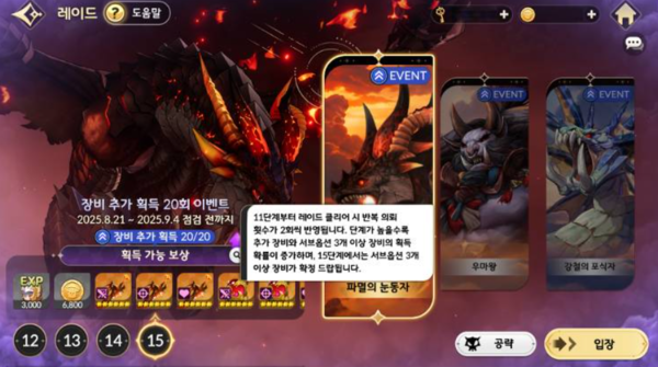 레이드 난이도가 상승함에 따라 얻을 수 있는 장비의 서브 옵션 개수는 3개로 늘어난다. 또한 일정 기간 장비 추가 획득 이벤트가 진행되면서 유저들의 장비 수급에 대한 스트레스를 완화하며 게임 서비스를 진행해 나간다.