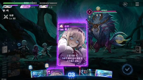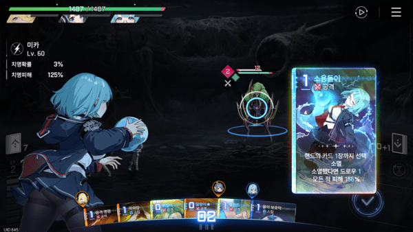 5종의 카드 중 하나를 선택해 적에게 끌면 공격이 이루어지고, 카드가 부족할 때는 무덤에서 카드를 추가할 수 있는 셔플 기능을 활용할 수 있다. 전투 중 적의 공격 예정을 나타내는 칼 아이콘과 방어 상태를 보여주는 방패 아이콘을 통해 전략적 판단을 내릴 수 있어, 단순한 자동전투가 아닌 진정한 의미의 전술적 게임 플레이를 추구한다.