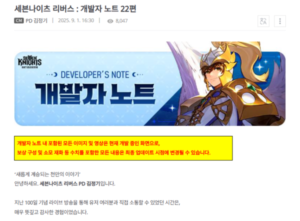 '세븐나이츠 개발진'은 서비스 개선과 업데이트를 멈추지 않고, 지속적으로 이어갈 예정임을 전했다. 마지막으로 김정기 PD는 "현재 고민 중인 개선 사항과 콘텐츠에 대해서는 어느 정도 방향이 정해지면 다른 개발자 노트를 통해 구체적인 소식을 전하도록 하겠다"며 "유저들이 게임을 통해 더욱 즐겁고 의미 있는 경험을 이어갈 수 있도록 노력을 기울이겠다. 감사하다"고 전하며 개발자 노트를 마무리 지었다.