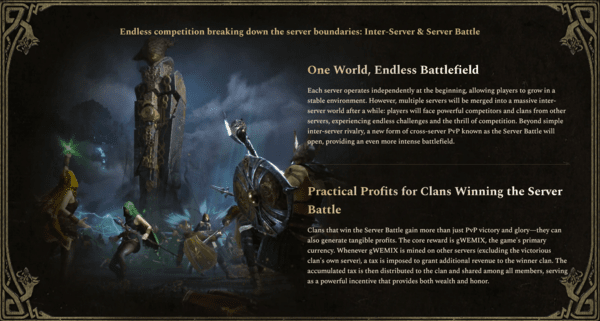 특히 주목할 점은 핵심 콘텐츠인 서버 대전 시스템이다. 서버 대전에서 승리하면 인터서버 내 모든 서버에서 발행된 gWEMIX의 일정량을 세금으로 받을 수 있어, 길드와 개인 유저 모두에게 강력한 동기부여 요소로 작용할 것으로 예상된다.