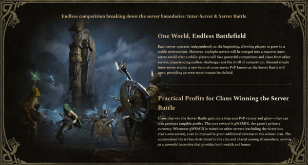 A standout feature is the server-versus-server system, where victorious servers can collect a portion of gWEMIX issued across all servers in the inter-server network as a tax, providing strong incentives for both guilds and individual players.