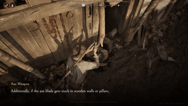 공격에 실패하면 캐릭터가 중심을 잃고 흔들리며, 위험한 상황에 노출될 수 있다. 이때 나무 기둥 등에 박힌 도끼를 빼내는 데 시간이 걸려 위기 상황을 초래할 수도 있다. 기존에 사용하던 쇠스랑과는 다른 맛이 있지만, 그만큼 리치는 짧다. 이러한 현실적인 무기 메커니즘은 플레이어로 하여금 무작정 공격하기보다는 신중한 판단을 내리도록 유도한다.