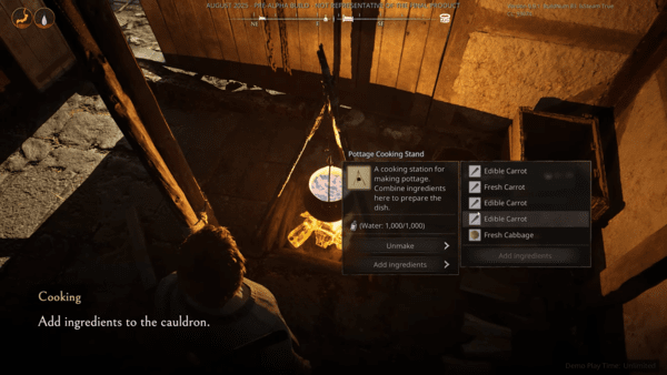 가장 흥미로운 추가 요소는 단연 요리 시스템이다. 요리 콘텐츠로 등장한 '포타지(pottage)'는 중세 사람들이 즐겨 먹던 전통 요리로, 큰 냄비에 물과 각종 재료를 넣고 끓여 만드는 요리다. 게임 내에서는 화로에 땔감을 사용하는 불 피우기부터 재료 준비, 조리, 식사까지의 전 과정을 단계별로 체험할 수 있다. 특히 불이 꺼지거나, 물이 부족하면 음식이 부패하거나 탈 수 있는데 이런 현실적인 시스템은 플레이어에게 지속적인 관리의 필요성을 부과한다.
