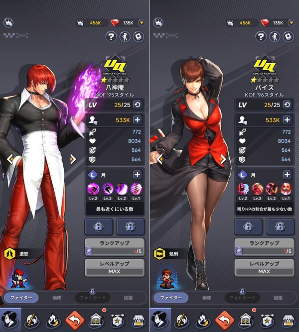 예를 들어, 료가 가진 ‘처형’ 시너지는 같은 속성을 가진 아군을 조합하면 적 격파 시 다음 공격에서 주는 데미지를 크게 증가시킬 수 있다. 이러한 시너지는 캐릭터마다 준비되어 있으며, 자신이 선호하는 캐릭터를 중심으로 덱을 구성할 수 있어 KOF다운 재미를 추구한다.