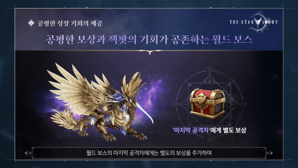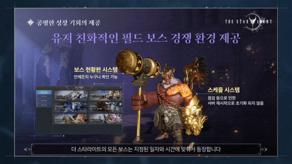 '더 스타라이트'만의 독특한 보스 시스템도 주목할 만하다. 모든 보스는 지정된 일자와 시간에 맞춰 등장하도록 설계해 유저들의 접근성을 대폭 개선했다.