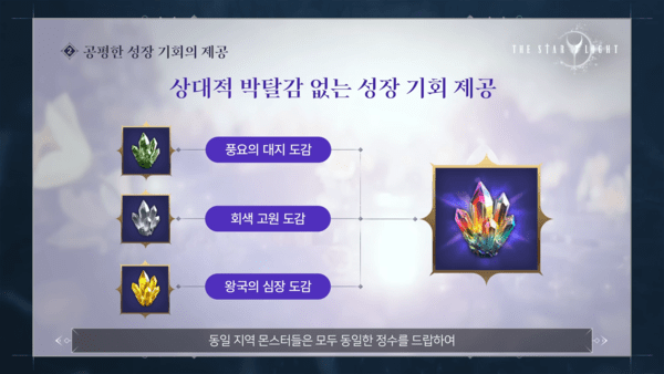 몬스터 도감 시스템은 몬스터가 드랍하는 '정수'를 도입해 동일 지역 몬스터들은 모두 동일한 정수를 드랍 하도록 설계했다. 도감 완성 시 경험치 손실 없이 몬스터 수집의 재미를 느낄 수 있으며, 보스 몬스터도 동일한 정수로 도감에 추가할 수 있어 누구나 노력으로 희귀 도감을 완성할 수 있다.