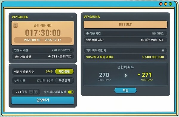 VIP 사우나에는 새로운 UI가 추가되어 남은 이용시간, 누적시간 등을 쉽게 확인할 수 있고, 자동 퇴장 레벨 설정 기능도 신설된다. 메이플스토리의 성장에서 중요한 역할을 담당하게 된 만큼 편의성을 높인 것이라고 개발진은 설명했다.
