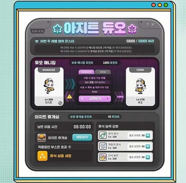 핵심 이벤트인 '아지트 듀오'는 260레벨 이상 캐릭터 2명을 동시에 육성하는 시스템이다. 매니저 캐릭터로 사냥하면 크루 캐릭터가 경험치와 솔 에르다를 받는 구조로, 챔피언 버닝의 1대1 버전으로 볼 수 있다. 부캐 육성 시 본캐의 경험치 손실을 방지하는 것이 주요 목적이다.