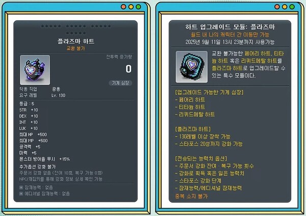 주목할 신규 아이템으로 '하트 업그레이드 모듈 플라즈마'가 추가된다. 기존 하트를 130제 하트로 업그레이드할 수 있게 해주는 아이템으로, 스타포스를 20성까지 강화할 수 있게 확장된다. 컴플리트 언더 컨트롤과 페어리 하트 사이의 간극을 메우기 위해 도입됐다.