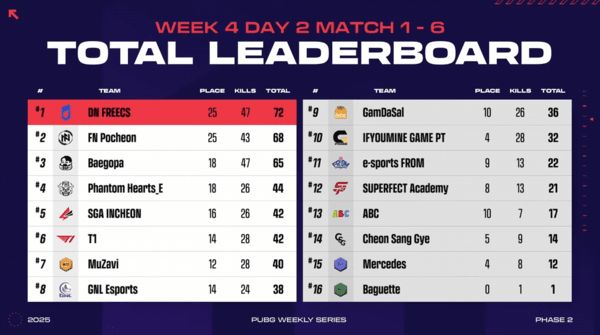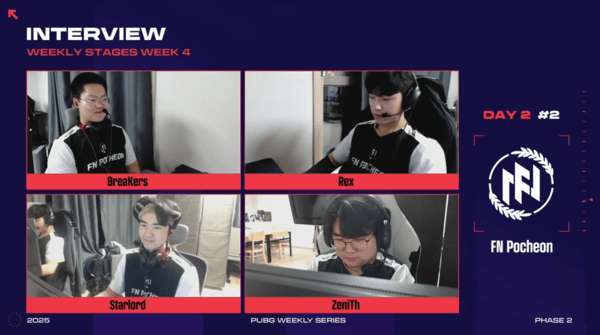 PWS: 페이즈2는 총 5주간의 대회 일정을 알렸다. 4주간의 위클리 경기를 통해 각 팀들은 상금과 순위 경쟁을 이어간 후 마지막 5주차 파이널 경기에서 최종 우승팀을 가리는 방식으로 진행을 예고했다. 이날은 본선 마지막 주차인 4주 2일차 경기가 진행되면서 최종 순위 싸움을 향한 치열한 전개가 이어졌다.