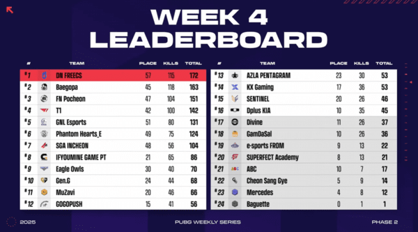DN프릭스가 크래프톤 주관으로 열린 '펍지 위클리 시리즈(PWS): 페이즈2' 4주 3일차 경기에서 좋은 경기력을 선보이며 결국 주차 1위를 가져갔다. 많은 팀들의 저돌적인 공세가 이어졌지만, DN프릭스는 끝까지 좋은 경기력을 펼쳤고, 결국 4주 연속 본선 1위라는 업적을 함께 가져갔다.