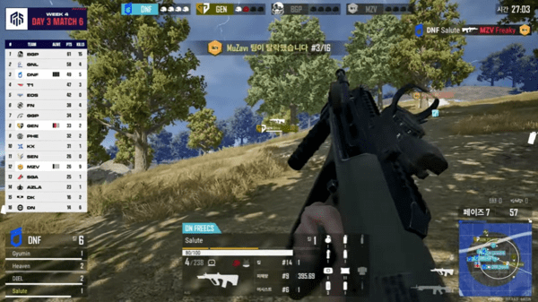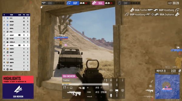 4주 3일차 첫 매치는 에란겔에서 열렸다. 갓카 지역이 중심부로 잡히면서 자기장 중앙 싸움보다는 외곽 슈팅 대결이 이어졌고 일찌감치 승패가 엇갈렸다. 배고파(BGP)는 빠르게 킬을 쌓아 나가면서 많은 포인트를 먼저 수급했다. DN프릭스는 훌륭한 경기 연계를 보여줬지만, 디바인과의 전투 속에서 T1과 EOS에게 둘러 쌓이며 조기 탈락하고 말았다.