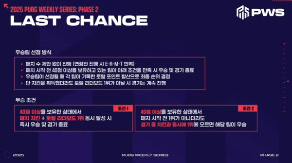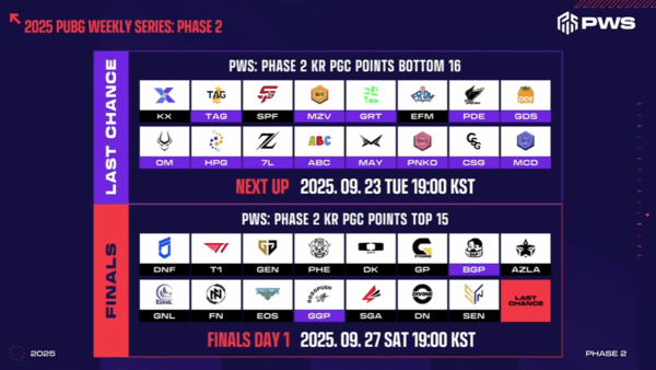 'PWS: 페이즈2' 파이널 경기는 오는 9월 27일부터 28일까지 이틀간에 걸쳐 오프라인 무대에서 열린다. 잠실 DN 콜로세움에서 열리는 PWS: 페이즈2 결승 경기를 통해 최종 우승팀과 더불어, 10월부터 진행될 '펍지 글로벌 시리즈(PGS)'와 '펍지 글로벌 챔피언십(PGC)'에 나설 한국 대표팀을 함께 가린다.