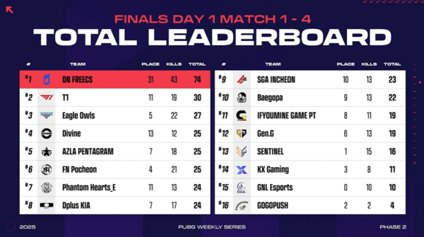 파이널 1일차 매치4까지 종료된 결과, 종합 1위는 74점으로 압도적인 경기력을 선보인 DN프릭스로 결정됐다. 이후 2위는 T1(30점), 3위는 EOS(27점), 4위는 디바인(25점)이 차지하며 남은 매치에서도 난타전을 예고했다.