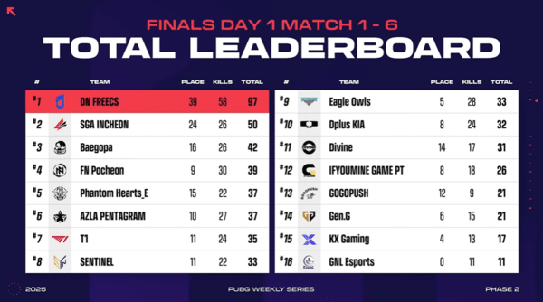 3연속 PWS 우승에 빛나는 DN프릭스가 4연속 우승을 향한 질주를 시작했다. DN프릭스는 PWS: 페이즈2 파이널 1일차 경기에서 연속 치킨을 포함해 압도적인 기량으로 종합 1위에 올랐다. SGA와 배고파(BGP) 등은 2위권을 형성해 글로벌 대회 진출 가능성을 높였다.