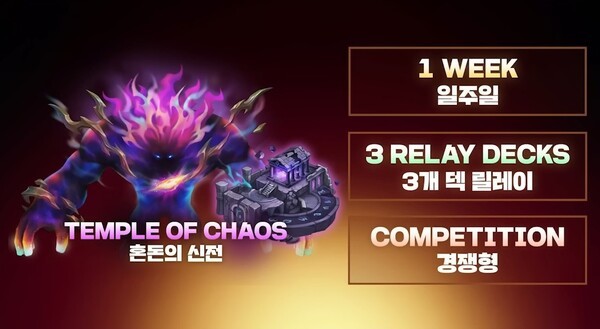 혼돈의 신전은 이계의 틈과 타모르 사막 사이의 새로운 지역에 추가되는 경쟁형 PvE 콘텐츠다. 월 1회 첫 번째 월요일부터 일요일까지 일주일간 운영되며, 각 소환사는 5마리씩 구성된 3개 덱으로 릴레이 형식 전투를 진행한다. 세 덱의 전투 점수를 합산해 소환사 간 랭킹을 겨루는 구조다.
