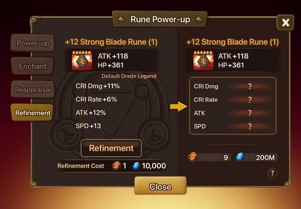 희귀 등급 룬은 드랍되지 않으며, 전설과 영웅 등급이 약 4대 6의 비율로 나타난다. 이를 통해 하루에 전설 룬 약 22.4개의 기대값을 얻을 수 있으며, 기존의 연속 전투 30회를 10회 반복했을 때와 유사한 수준의 보상을 500 에너지 사용으로 달성 가능해진다는 계산이다.
