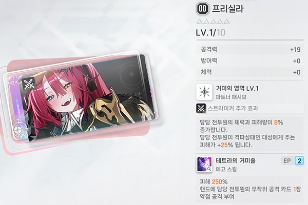 스트라이커 전용 파트너 ‘프리실라’는 체력과 피해량을 8% 높여주는 능력을 가지고 있다. 특히, 격파상태인 대상에게 주는 피해를 25%나 추가로 올려줘, ‘메이린’과 궁합이 좋다. 격파상태란 몬스터의 강인도가 모두 감소한 상태를 말하는데, 메이린은 '잔불' 효과까지 더해 격파상태인 대상에게 더 높은 피해를 줄 수 있다.