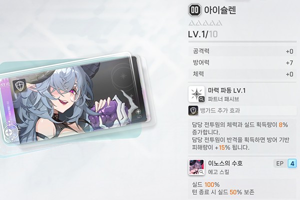뱅가드 직업군의 파트너 ‘아이슐렌'은 체력과 실드 획득량 8% 증가 효과를 지니며, 반격 시 피해를 15% 강화하는 패시브를 갖고 있다. 반격에 특화된 '마그나'에 가장 적합한 파트너다. 에고 스킬 '이노스의 수호'는 실드 100% 발동과 함께 턴 종료 시 실드 50%가 보존되어 방어력을 강화하는데 도움을 준다.