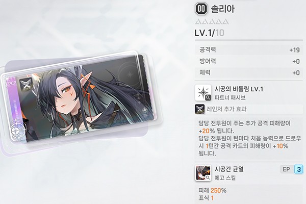 레인저 계열의 ‘솔리아’는 추가 공격 피해량을 20% 높이고, 카드 드로우를 보조해 전투 템포를 빠르게 만들어준다. 카드 회전율이 전투 핵심인 레인저에게는 나쁘지 않은 선택으로서, '베로니카'와 어울린다. 4성 파트너 '로자리아'가 추가 공격 피해량 10%라 '솔리아'의 능력이 더 좋지만, 로자리아와 베로니카의 조합이 훌륭해 1명을 선택해야 하는 '아르키아논 보급' 보상으로 얻기에는 조금 아쉬운 파트너다.