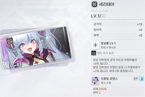 헌터 직업의 ‘세리테아’는 치명 확률 8% 증가, 치명 피해량 최대 5회 중첩을 통해 피해가 15%까지 증가한다. 어울리는 전투원은 '레노아'와 ‘루크’로서, 에고 스킬 '진홍빛 로맨스' 또한 피해 250%라는 아쉽지 않은 데미지에 취약까지 더해져 한 방에 강한 헌터와 잘 어울린다.