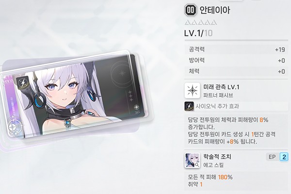 사이오닉 계열의 ‘안테이아’는 전투원의 체력과 피해량을 8% 올리고, 전투원이 카드 생성 시 1턴간 공격 카드 피해량이 8% 증가한다. 추천 요원은 '카일론'이며, 카드 생성 능력으로 서로 좋은 시너지를 자랑한다. 특히, 에고 스킬 '학술적 조치'는 모든 적에게 데미지를 입히고, 피해도 180%라 나쁘지 않다.