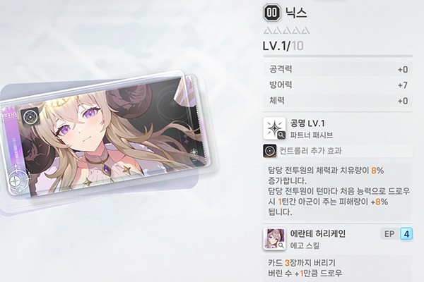 컨트롤러 직업의 파트너 ‘닉스’는 체력과 치유량 8% 상승에 더해, 에고 스킬 ’에란테 허리케인'으로 사용하지 않은 카드를 버리고 새로 뽑을 수 있는 기능을 지닌다. 이 능력 덕분에 카드 운용의 유연성이 크게 올라가며, 전투 흐름을 유리하게 가져갈 수 있어 '카시우스'와 상당히 좋은 조합을 보인다. 특히 전투원이 턴마다 드로우 시 피해량이 8% 증가하는 능력도 갖춰 '카시우스' 전용 파트너라 봐도 무방하다.