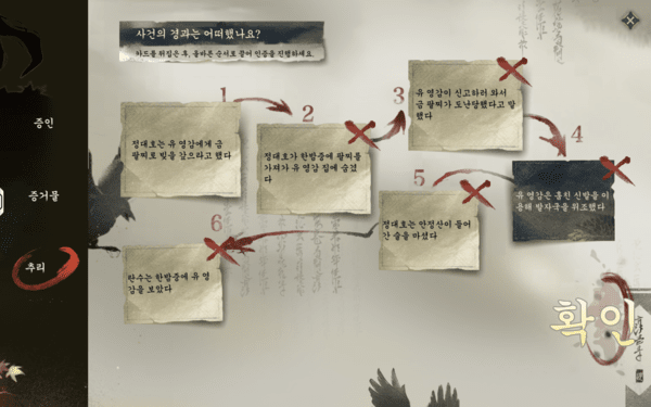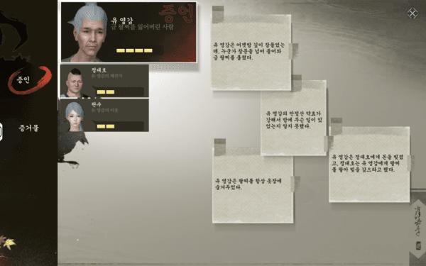 이런 과정에서 만나는 퀘스트의 방대함 덕분에 자연스럽게 세계관이나 인물에 집중하게 된다. 예를 들어 사건을 조사하고 단서를 모아 해결하는 ‘추리형 퀘스트’는 캐릭터를 움직여 단서와 증거를 수집하고 모은 증거로 사건을 배열하는 일종의 탐정 미션 같은 느낌을 제공한다.