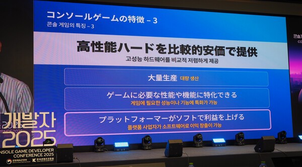 셋째로 고성능 하드웨어를 비교적 저렴하게 제공할 수 있는 점을 뽑았다. 요시다는 대량생산을 통한 하드웨어의 가격 절감, 그리고 게임에 특화된 CPU/GPU 설계를 통해 높은 성능을 상대적으로 낮은 가격에 제공할 수 있는 구조가 콘솔의 지속 가능성을 만들어낸다고 밝혔다.