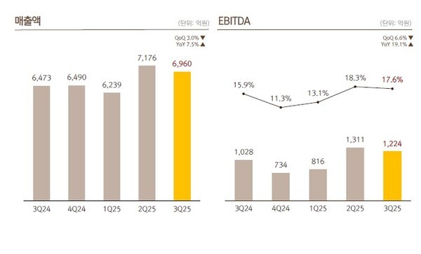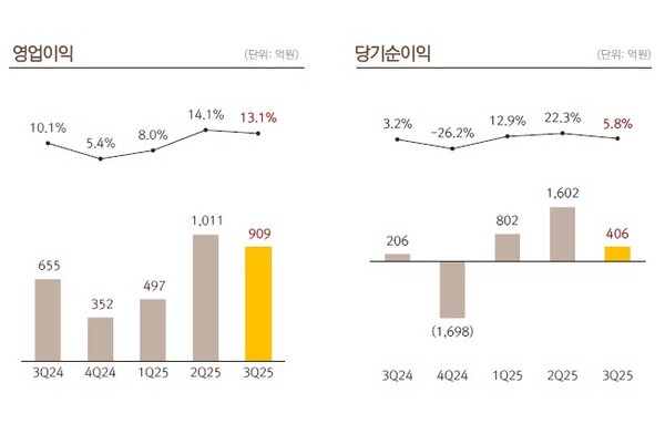 넷마블이 6일 발표한 2025년 연결기준 3분기 실적에 따르면 매출 6,960억 원, 영업이익 909억 원, 당기순이익 406억 원을 기록한 것으로 나타났다.