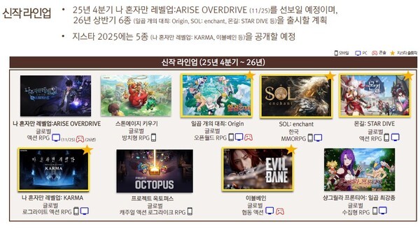 넷마블은 4분기에 신작으로 11월 25일 '나혼자만 레벨업: 어라이즈 오버드라이브' 1종을 선보인 뒤, 2026년 상반기에만 6종의 다양한 장르와 플랫폼의 게임을 출시한다는 계획이다.