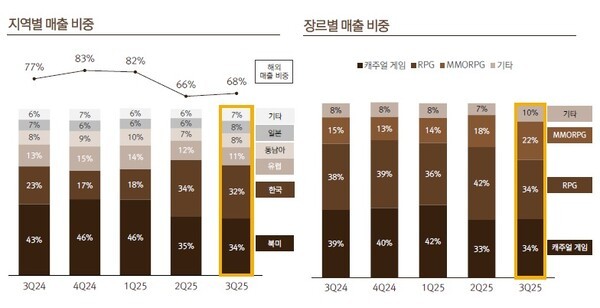 지역별 매출은 북미가 34%로 가장 많았고 한국이 32%, 유럽 11%, 동남아와 일본이 8% 등이었다. 전체적으로 1~2%씩 감소했지만 일본과 기타 지역의 매출이 상승하면서, 해외 매출 비중은 전분기 대비 2% 상승한 68%를 기록했다. 장르별 매출 비중은 캐주얼 게임 34%, RPG 34%, MMORPG 22%, 기타 10%로 다변화된 장르 포트폴리오가 지속되고 있다.