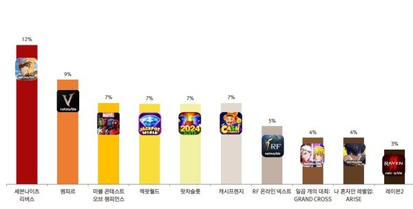 서비스 게임 중 매출은 '세븐나이츠 리버스'가 12%로 가장 높았고, '뱀피르가' 9%로 그 뒤를 이었다. 그리고 ‘마블 콘테스트 오브 챔피언스’와 ‘잭팟월드’, ‘랏차슬롯’, ‘캐시프렌지’가 각각 7%를 기록하며 고른 매출 분포를 보였다. 그리고 ‘RF온라인 넥스트’가 5%, ‘일곱개의 대죄:그랜드크로스’와 ‘나혼자만 레벨업:어라이즈’가 4%, ‘레이븐2’가 3%를 기록했다. 기타 게임 매출은 35%를 차지했다.