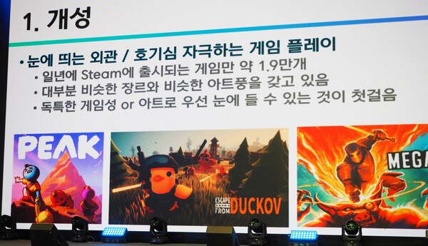 그는 단순히 그래픽이 좋은 것만으로는 부족하다고 말하며, “게임에 오리를 접목한 ‘이스케이프 프롬 덕코프'를 비롯해 협동해서 산을 오르는 게임 'PEAK'처럼 한눈에 들어오는 시각적·주제적 개성이 중요하다”고 강조했다.