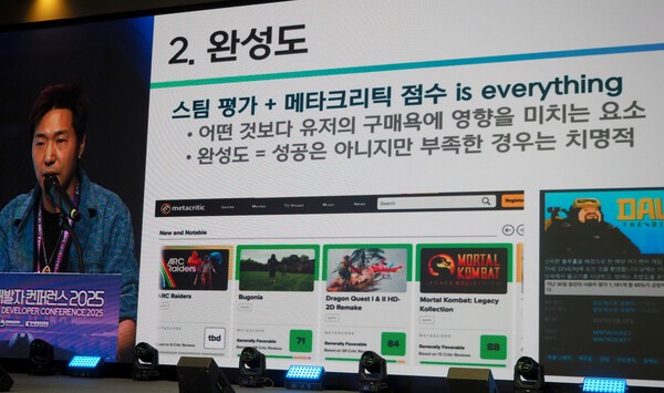그가 두 번째로 강조한 것은 ‘완성도’였다. “스팀 평점과 메타크리틱 점수는 곧 신뢰도다. 한 번 낮아지면 회복이 거의 불가능하다. 출시가 늦더라도 완성도를 확보하는 게 낫다”.