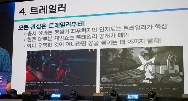 황 대표는 넥슨의 ‘퍼스트 디센던트’를 예로 들며, “초기엔 주목을 못 받았지만, 한 편의 세련된 트레일러가 분위기를 완전히 바꿨다”고 말했다. 조회수 200만을 돌파한 'MOUSE: P.I. For Hire'라는 게임에서는 흑백 만화풍 예시를 들며 “독특한 비주얼은 그 자체로 조회수를 끌어올린다”고 조언했다.