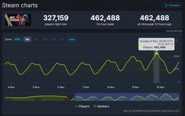 이후 게임은 하락세 없이 상승세로 서비스를 지속했다. 두 번째 주말이었던 지난 11월 8일과 9일에는 스팀 플랫폼 기준 첫 주말이었던 35만을 넘어 46만 명의 유저가 한꺼번에 접속하는 성적을 거뒀다. 이는 스팀 플랫폼 3대장 '카운터 스트라이크2'와 '도타2', '배틀그라운드'에 이은 네 번째 성적으로, 경쟁작인 '배틀필드6'를 누르면서 2025년 11월 최고의 게임이 됐다.