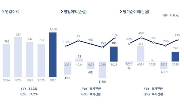 펄어비스의 3분기 실적이 발표됐다. 펄어비스가 12일 발표한 2025년 연결기준 3분기 실적에 따르면 매출 1,068억원, 영업이익 106억원, 당기순이익 290억 원을 기록한 것으로 나타났다.