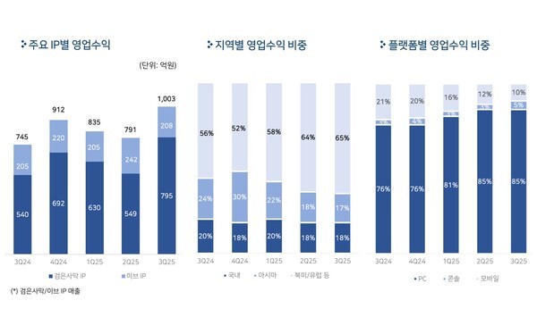 IP별 매출을 보면 ‘검은사막’ IP가 795억 원으로 전분기 대비 45% 증가한 것이 눈길을 끈다. 지역별 매출에서는 북미/유럽이 65%로 여전히 견고하며, 국내가 18%, 아시아가 17%로 그 뒤를 이었다. 플랫폼별 매출에서도 PC가 81%로 더욱 상승하는 모습을 보여줬다.