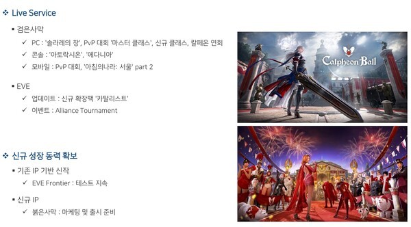 그리고 신규 성장 동력 확보를 위해 ‘이브 프론티어’의 테스트를 지속하며 신규 유저 유입에 집중하고, ‘붉은사막’의 출시 준비 및 다양한 마케팅을 이어 나가며 출시에 집중한다는 계획이다.