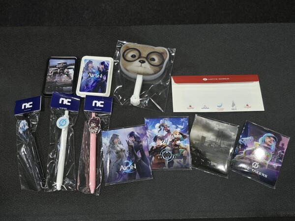 먼저 엔씨소프트 부스는 크게 '아이온2'와 '신더시티' 체험 후 받는 굿즈로 구성되어 있다. 포토카드와 펜, 부채, 보조배터리 등이다. 운이 좋으면 롯데월드 입장권도 받을 수 있다.