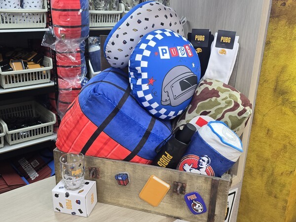 그 옆에 있는 '카페 펍지'에서도 이벤트를 통해 받을 수 있는 다양한 굿즈가 마련되어 있다. 컵부터 양말, 쿠션, 우산, 보조배터리까지 실생활에 유용한 것들로 채워졌다.