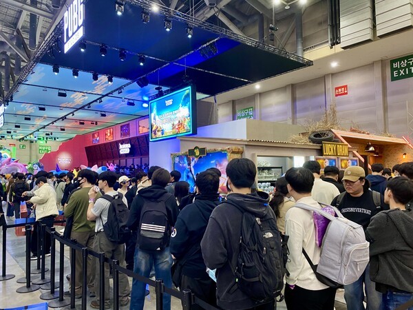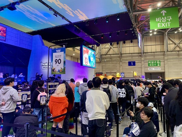 크래프톤이 공개한 '팰월드 모바일' 지스타 부스, 90분이 넘는 대기시간에도 관람객들이 질서있게 줄을 서고 있다.