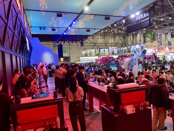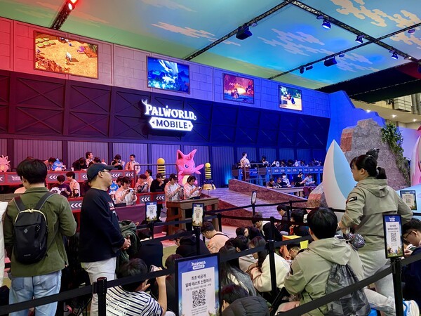 '팰월드 모바일' 부스 현장에는 안내 도우미들이 관람객들을 맞이하며, 안정적인 게임 시연을 돕고 있다.