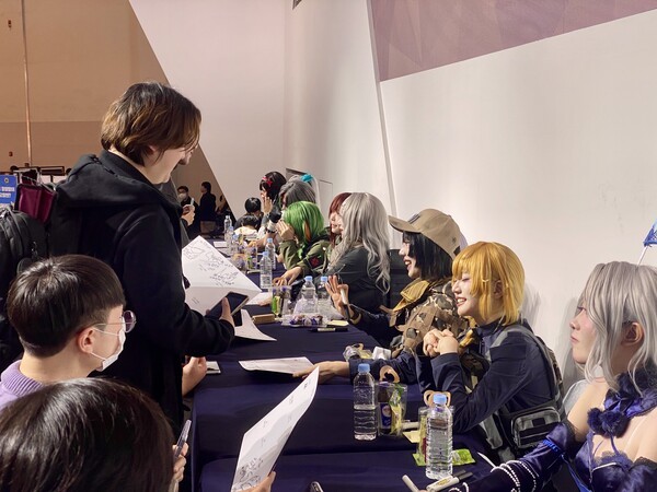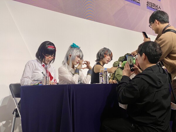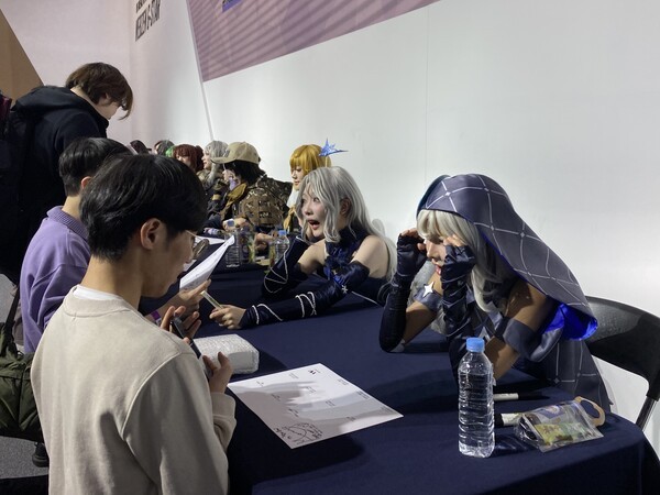 웹젠 부스에 참가한 코스프레팀은 현장에서 관람객들에게 직접 사인과 사진 촬영을 해주며 인기몰이를 하고 있다.